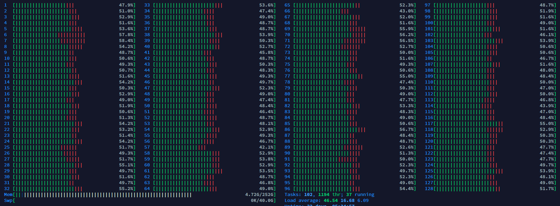 tar -I pigz -cf [파일명.tar.gz] [폴더명]아래와 같이 다중 코어를 잘 사용함을 확인할 수 있다.