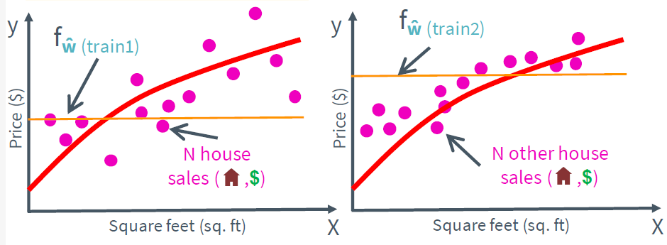 Variance는 highly flexible models에 데이터를 fitting 시킴으로써, 실제 현상과 관계없는 random 한 것들까지 학습하는 알고리즘의 경향을 가진다. 따라서 아래와 같이 모델의 complexity가 크다면 variance가 커진다.