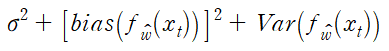 이제 앞서 설명했듯이 prediction error가 bias, variance, noise 항으로 이루어진 이유를 설명하겠다. 먼저 특정한 xt에 대해 다음이 성립한다.
