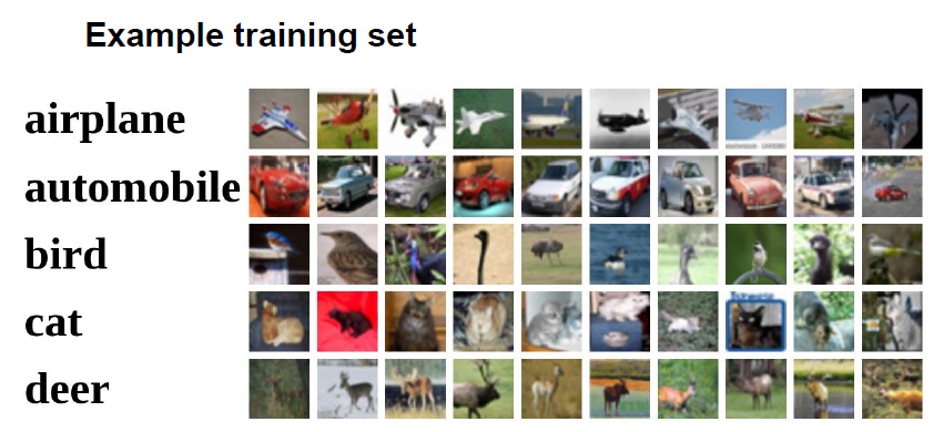 일반적인 방법으로 Image Classification 알고리즘을 작성하는 것은 매우 어렵다. 그러므로, 코드를 통해 직접적으로 모든 것을 카테고리로 분류하기보다는 좀 더 쉬운 방법을 사용해야 한다. 먼저 컴퓨터에게 각 클래스에 대해 많은 예제를 주고 나서 이 예제들을 보고 시각적으로 학습할 수 있는 학습 알고리즘을 개발하는 것이다. 이런 방법을 data-driven approach이라고 한다. 이 방법은 라벨화가 된 이미지들 training dataset이 처음 학습을 위해 필요하다. 위의 그림은 이런 데이터셋의 예이다.