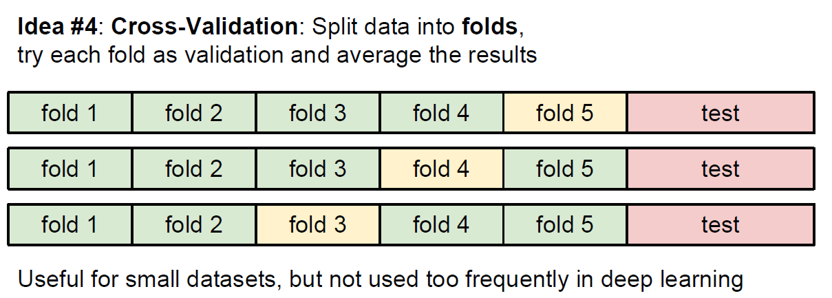 만약 학습 데이터 셋의 크기가 작을 경우, 조금 더 정교한 방식으로 cross-validation(교차 검증)이라는 hyperparameter 튜닝 방법을 사용한다. 예를 들어, 5-fold 교차 검증에서는 학습 데이터를 5개의 동일한 크기의 그룹(fold)으로 쪼갠 뒤, 4개를 학습용으로, 1개를 검증용으로 사용한다. 그다음에는 어떤 그룹을 검증 셋으로 사용할지에 따라 iteration(반복)을 돌고, 성능을 평가하고, 각 그룹에 대해 평가한 성능을 평균을 낸다.