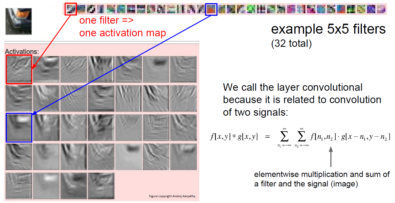이러한 필터는 이미지와 convolution 연산을 하는데, 이미지 위의 5x5x3의 원소들과 필터의 5x5x3 원소들과의 내적을 하게 된다. 이때 bias항이 더해진다. 이러한 과정은 convolution과 약간의 차이가 있지만 결과적으로 거의 유사하여 Convolutional Neural Networks라고 불린다. 결국 5x5x3=75번의 내적을 수행한다. 필터로 convolution되는 layer를 convolution layer라고 부른다.