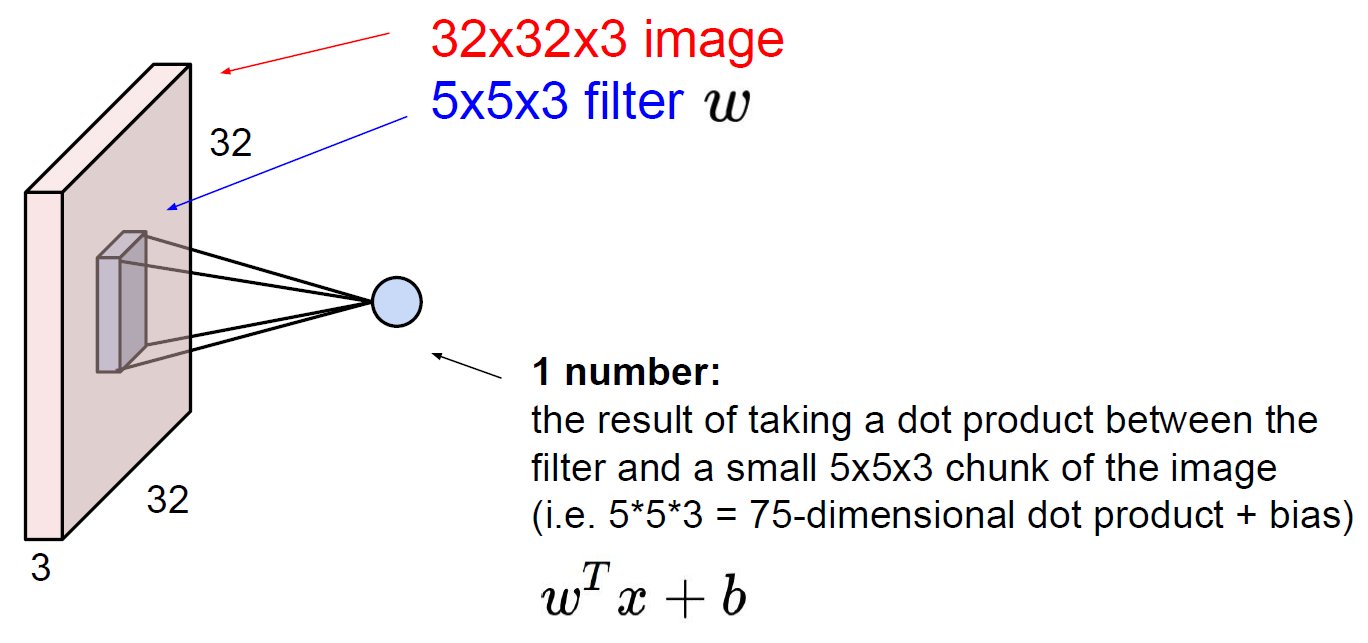 이러한 필터는 이미지와 convolution 연산을 하는데, 이미지 위의 5x5x3의 원소들과 필터의 5x5x3 원소들과의 내적을 하게 된다. 이때 bias항이 더해진다. 이러한 과정은 convolution과 약간의 차이가 있지만 결과적으로 거의 유사하여 Convolutional Neural Networks라고 불린다. 결국 5x5x3=75번의 내적을 수행한다. 필터로 convolution되는 layer를 convolution layer라고 부른다.