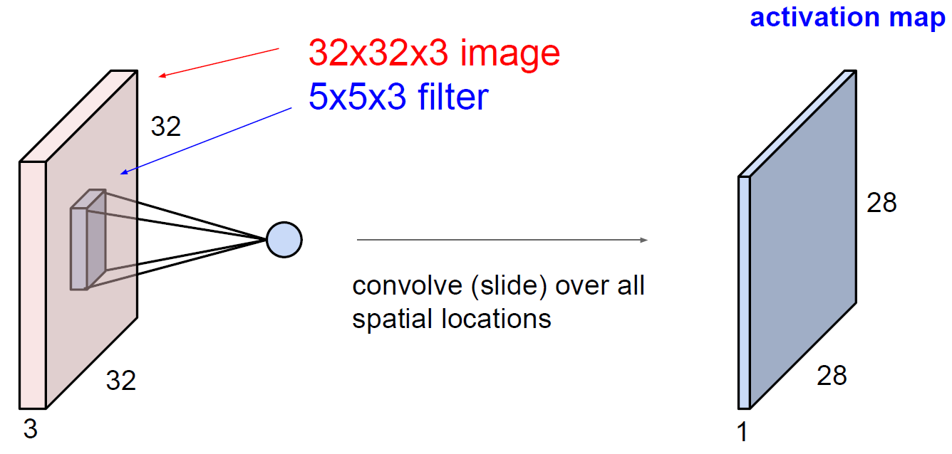 이 필터가 이미지 위를 slide 하면서 모든 위치에 대해 convolution을 수행하면 결과적으로 28x28x1의 activation map이 출력된다. 결국 필터 하나당 activation map의 depth 한 층이 생성되는 것이다.