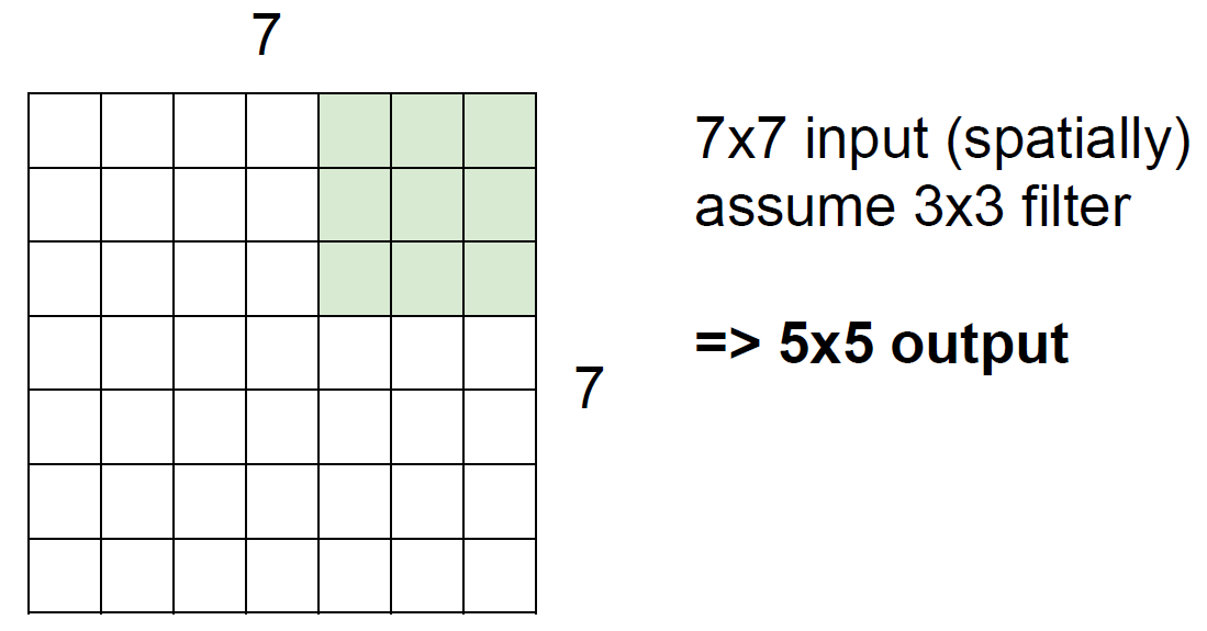 convolution 이후 이미지의 크기가 감소하는 이유는 필터의 크기 때문이다. 위와 같이 3x3 필터가 7x7 이미지를 통과하면 (상하좌우 1칸씩 움직여서) 5x5 이미지로 그 크기가 감소할 것이다. 이때 필터가 움직이는 크기를 stride라고 하는데 이 경우는 stride=1이다. 만약 stride가 2라면 출력 이미지는 3x3으로 더욱더 작아질 것이다.