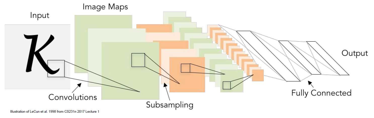 Convolutional Neural Networks(CNN)의 역사는 넘어간다. 아래 그림은 초창기의 CNN 구조 중 하나이다.