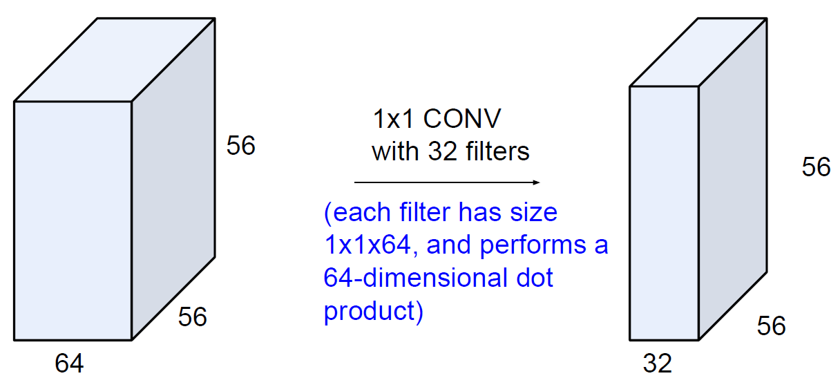 어떠한 경우는 1x1 크기의 필터를 사용하는 경우가 있는데, 이 경우 이미지의 크기는 동일하나 depth를 필터의 개수만큼으로 변화시킨다. 예를들어 32개의 1x1 필터를 사용하면 출력 이미지의 depth는 32가 된다.
