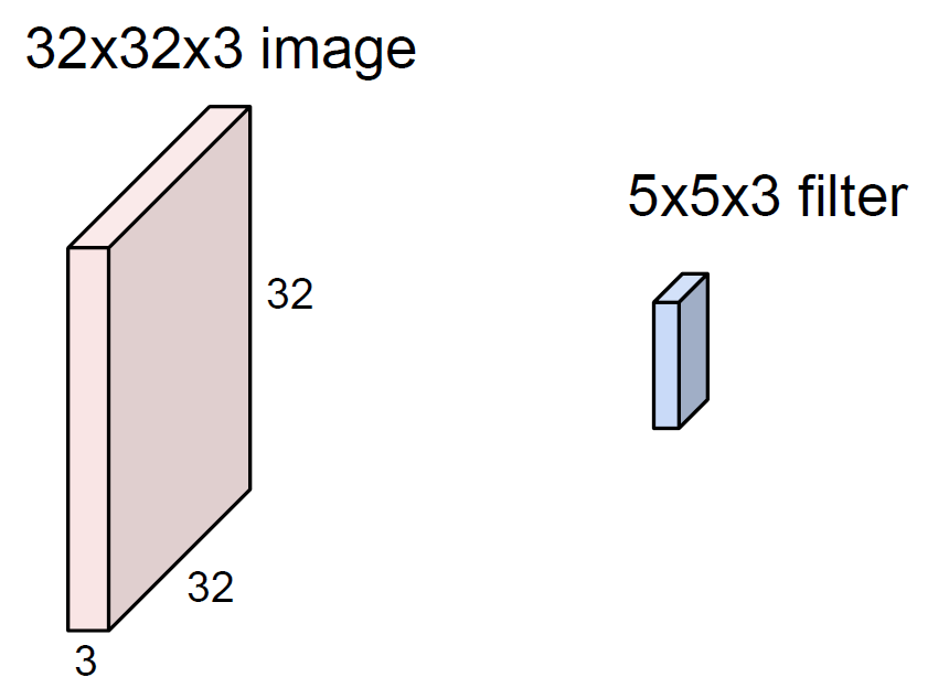 CNN의 layer들은 필터에 의해 연산된다. 예를 들어 아래와 같이 입력 이미지의 크기를 32x32x3이라 하고 필터의 크기를 5x5x3이라고 하자.