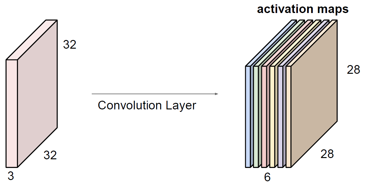 예를 들어 필터를 6개를 사용한다면 activation map의 크기는 28x28x6이 된다. 따라서 activation map을 입력으로 가지는 새로운 layer는 depth가 6인 필터를 사용해야 한다.