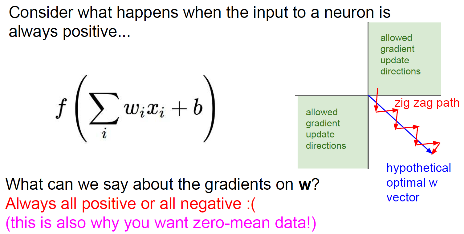 activation function이 zero-centered하지 않다면 gradient가 모두 양수 혹은 음수만 발생한다는 문제가 있다. 만약 activation function을 통과한 값이 위와 같이 $f\left({\sum_i^{}{w_i}{x_i}+b}\right)$이라 하면 $\frac{\partial f}{\partial w_i}=x_i$이고 chain rule에 의해 $\frac{\partial L}{\partial w_i}=\frac{\partial L}{\partial f}\times\frac{\partial f}{\partial w_i}=\frac{\partial L}{\partial f}\times{x_i}$가 되므로 $x_i$의 부호가 고정되면 전체 gradient의 부호도 결정됨을 알 수 있다. 이렇게 되면 위와 같이 가중치가 지그재그로 업데이트되어 학습이 전체적으로 느려지게 된다.