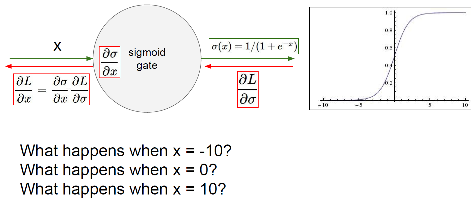 만약 sigmoid의 입력이 10 또는 -10과 같이 다소 큰 값이라면 local gradient $\frac{\partial \sigma}{\partial x}$는 거의 0이 된다. 따라서 back propagation으로 전달되는 gradient $\frac{\partial L}{\partial x}$ 역시 0 이므로 back propagation이 진행되어도 gradient가 모두 0이 된다. 이러한 현상을 gradient가 죽는다(kill)라고 말한다.