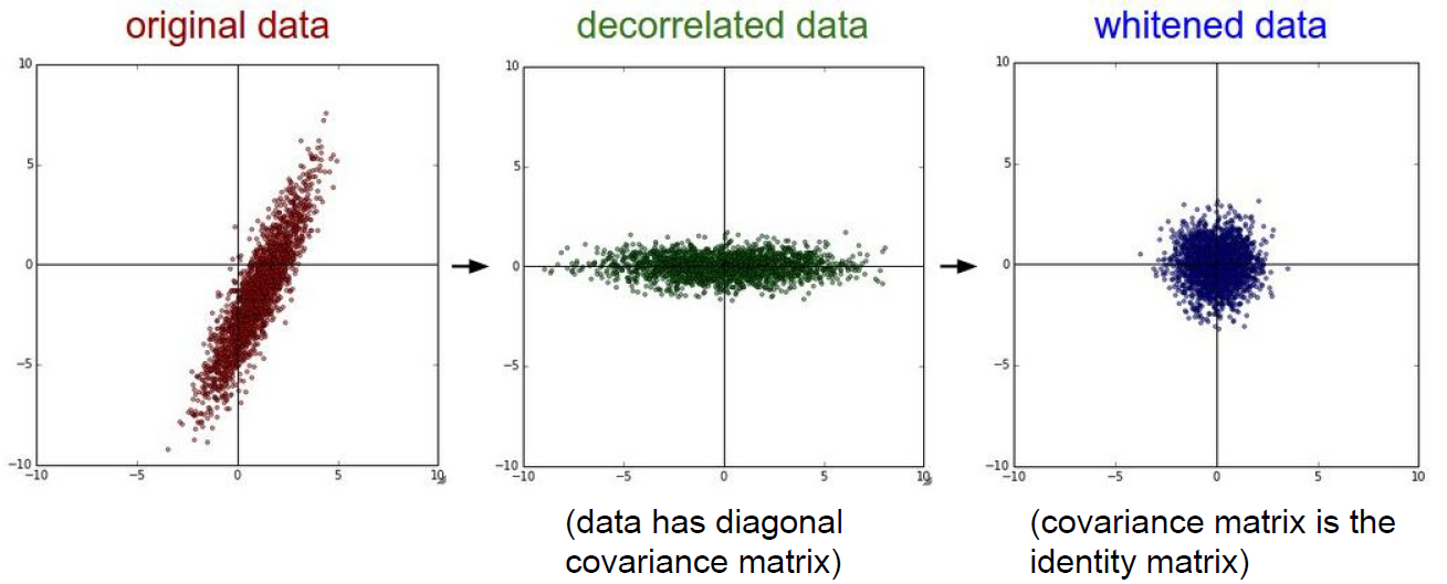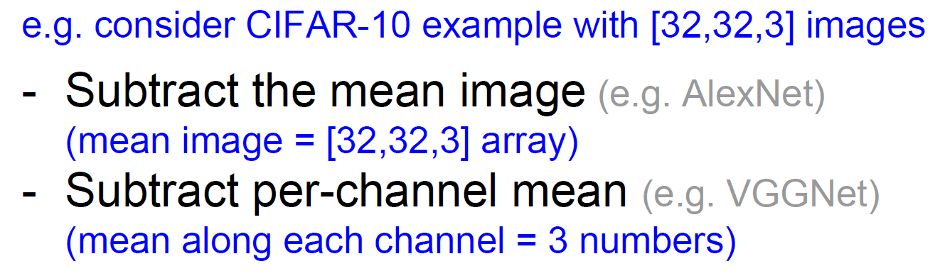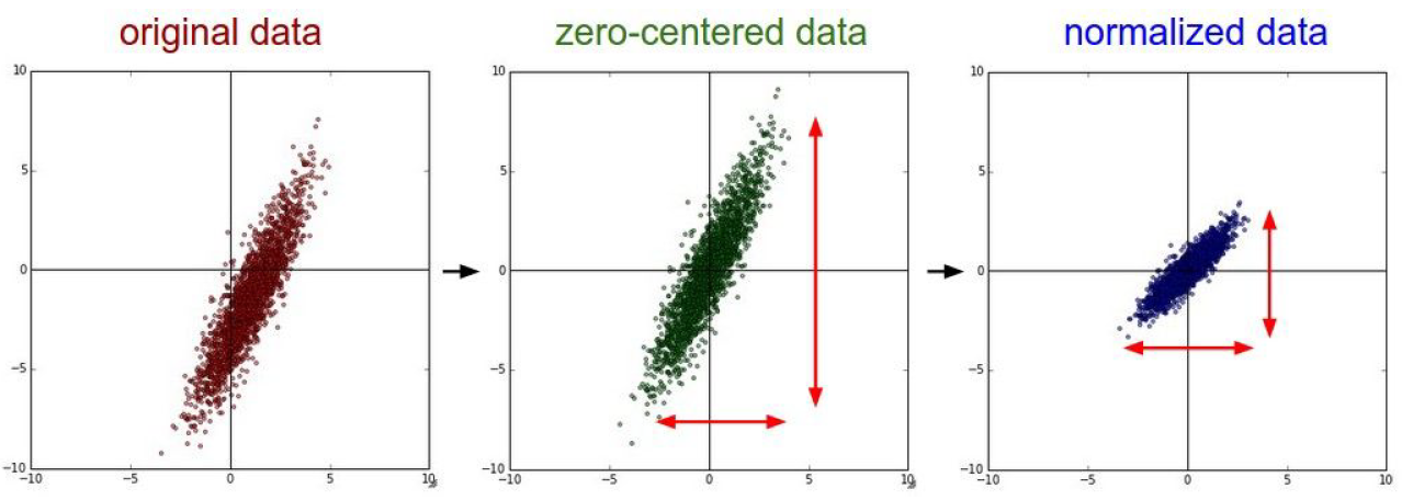 실제로 이미지를 다루는 image classification에서는 zero-centered 과정만 주로 사용한다고 생각하면 편하다. centered과정은 전체 이미지 픽셀의 중심값을 구하거나 RGB 각각의 채널의 중심값을 구하는 등 여러 가지 방법이 존재한다.