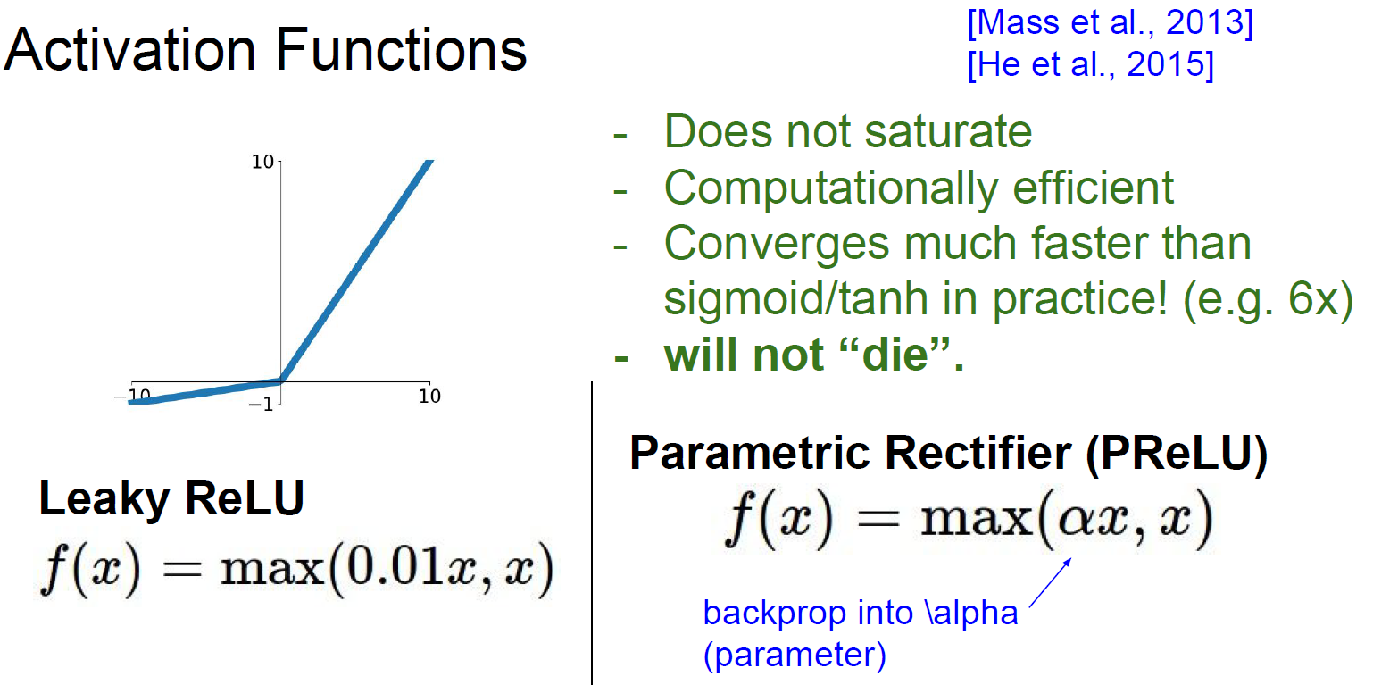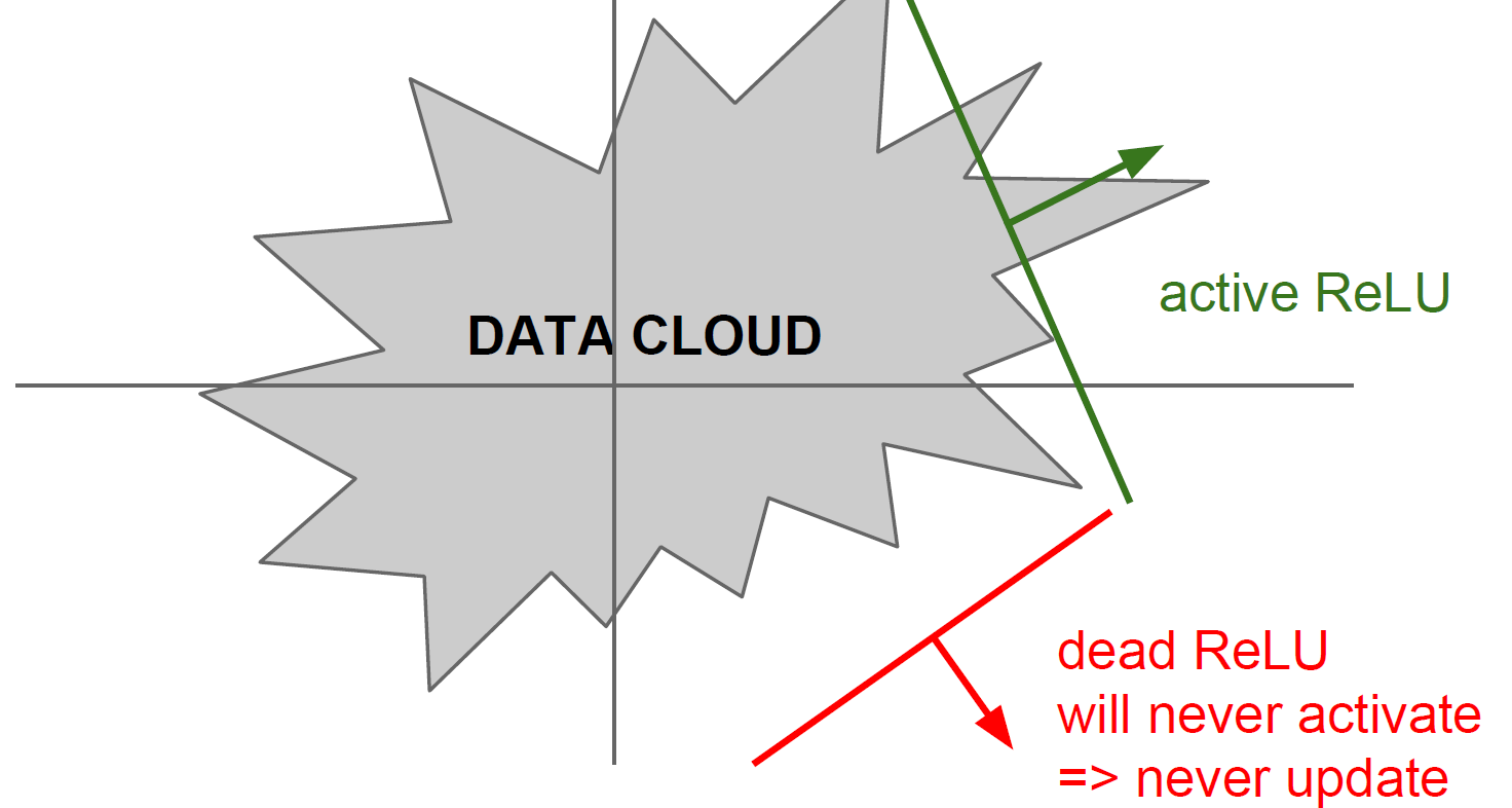 흔히 이 saturation 영역에 의해 back propagation이 되지 않는 경우를 dead ReLU라고 한다. 이러한 상태는 초기 가중치가 잘못 주어지던가 train rate가 높으면 발생할 수 있다. 이러한 문제를 해결하기 위해 일부 사람들은 초기 bias를 0.01과 같이 양수를 주어 saturation 영역을 피하려 하지만 이 방법은 호불호가 있어 대부분 bias의 초기값을 0을 준다고 생각하면 된다.
