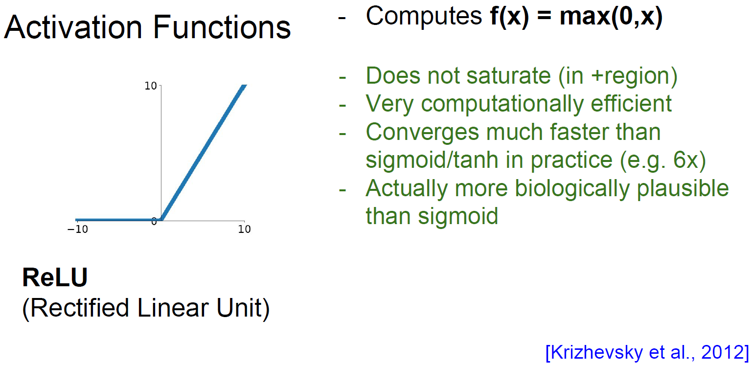 ReLU는 현재 가장 많이 쓰이는 activation function중 하나이다. ReLU는 기본적으로 $f(x)=\max{(0,x)}$ 형태를 띠는데, 양수에서는 saturation 영역이 존재하지 않고 sigmoid, tanh(x)에 비해 학습 속도가 6배나 빠르다는 장점이 있다. 하지만 음수에서는 모두 saturation 하며 zero-centered하지 않다. 실제로 ReLU로 학습하면 전체 노드의 10~20% 정도가 gradient가 죽는다.