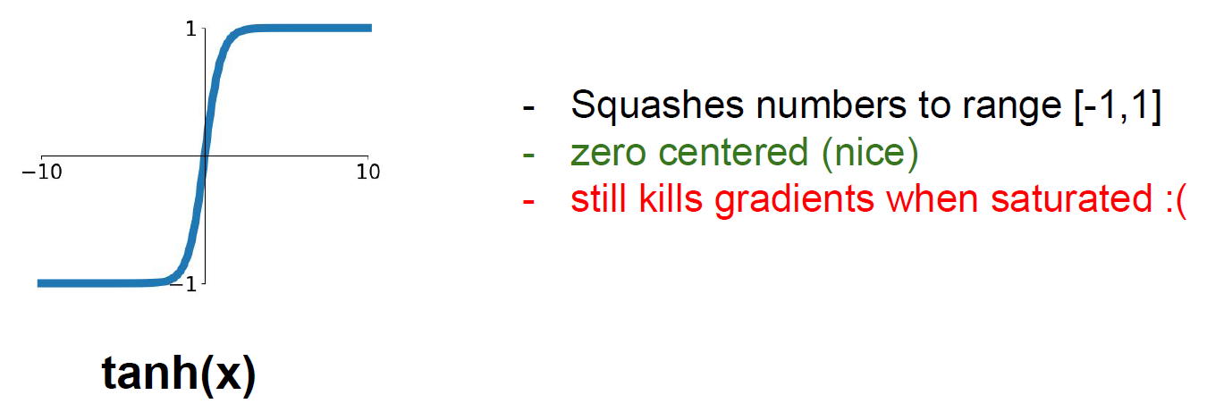 tanh(x)도 사용되기도 하는데 이 함수는 zero-centered이지만 역시나 saturated 영역이 존재한다는 문제가 있다.