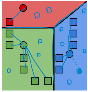 i 번째 데이터와 j번째 cluster center의 거리를 측정하여 가장 짧은 거리의 cluster를 반환한다. 이를 시각화하면 다음과 같다.