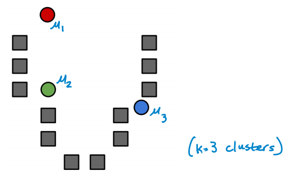 이제 cluster centers(cluster 중심)을 초기화한다. 만약 3개의 cluster가 필요하다면 다음과 같이 임의의 위치에 3개의 cluster centers를 설정하면 된다. 각각의 cluster center를 u_1, u_2, u_3라 하자.