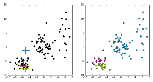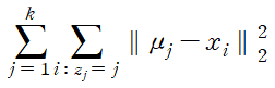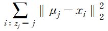 그렇다면 어떤 k-means의 결과가 더 좋다고 말할 수 있을까? 일반적으로 k-means 알고리즘은 데이터와 cluster center 사이의 제곱 거리를 최소화한다. 따라서 두 그래프의 아래 식의 값을 비교하면 더 좋은 k-means 결과를 결정할 수 있다.