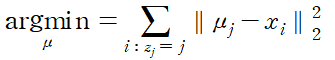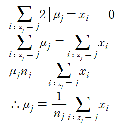 n_j는 j번째 포함된 데이터의 총 개수로 따라서 수정된 cluster center는 각 cluster에 포함된 데이터들의 무게중심이라 봐도 무방하다. 실제로 이 지점은