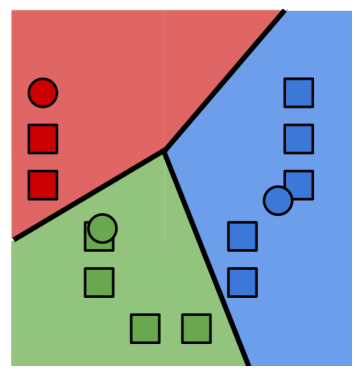각 색깔 영역은 특정 cluster center과 가장 가까운 영역이다. 예를 들어 초록색 영역의 모든 데이터셋은 초록색 cluster center와 가장 가깝다.