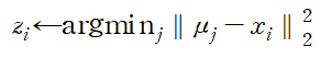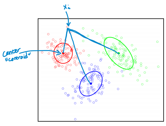 그렇다면 cluster는 어떻게 정의될까? 아래 그림과 같이 임의의 데이터 x_i의 cluster는 각 cluster들의 중심까지의 거리가 가장 짧은 cluster로 정의된다.
