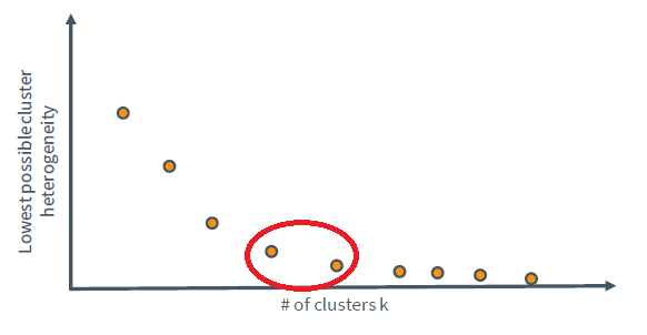 이 값은 흔히 heterogeneity라 불리며 값이 작을수록 더 좋은 k-means의 결과를 의미한다. 그렇다면 k는 어떤 값으로 설정해야 할까. 극한의 상황을 가정하여 k=N이라 할 수 있겠다. 이 경우 cluster의 개수가 데이터수와 같기 때문에 k-means의 결과 heterogeneity는 0으로 수렴할 것이다. 하지만 분명히 이것이 좋은 결과는 아니다. 실제로 k의 크기에 따라 heterogeneity의 크기를 비교하면 아래 그래프와 같다.