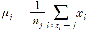 이제 이렇게 분류된 데이터들을 이용해 cluster center를 수정한다. 수정된 cluster center는 다음과 같이 표현된다.