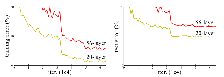 최근까지의 network들은 depth가 중요한 요소로 여겨졌고, 더 깊은 모델일수록 더 좋은 성능이 나온다고 여겨졌다. 하지만 gradient vanishing/exploding의 문제로 depth가 증가하면 일정 깊이 이상에서 오히려 성능이 떨어지는 degradation(저하, 악화) 현상을 보인다. 이러한 degradation 문제는 overfitting이 원인이 아니라 depth가 깊어짐에 따라 training-error가 높아진다는 것이다. 아래 그림을 참고하자.
