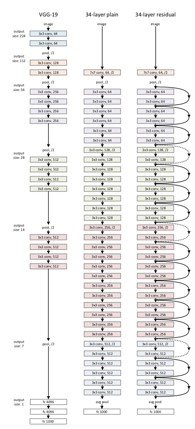 먼저 Plain Network는 가운데 그림과 같이 단순히 layers를 쌓은 networt이다. conv layers는 거의 3X3 filters를 가지고 있고, 다음의 간단한 규칙을 따른다.