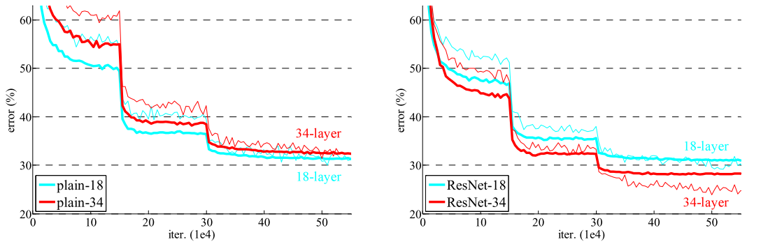 ResNet은 ImageNet을 통해 degradation문제와 모델 평가에 대해 검증하였다. 첫 번째로, ResNet의 deep한 model은 optimize하기 쉽지만, 그 반대인 plain networks는 depth가 깊어짐에 따라 높은 training error을 보였다. 그리고 두 번째로, deep한 residual networks는 depth가 깊어져도 이전의 plain networks 보다 쉽게 accuracy를 도출해낼 수있었다.