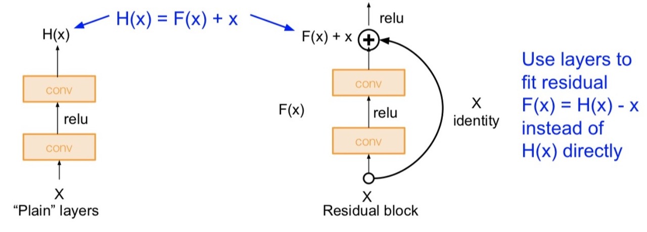 기존의 neural network의 학습 방식은 입력(x)을 타겟값(y)로 맵핑하는 함수 H(x)를 찾는 것이었다. 즉 H(x) - y를 최소화 하는 방향으로 학습을 진행한다. ResNet에서는 입력과 출력의 잔차를 F(x) = H(x) - x라고 정의를 하고 결과적으로 출력 H(x) = F(x) + x가 된다. 이렇게 네트워크의 입력과 출력이 더해진 것을 다음 레이러의 입력으로 사용하는 것을 skip connection 이라고 한다. 기존의 neural network는 H(x)가 어떻게든 정답과 같게 만드는 것이 목적이었다면, 이제 입력과 출력 사이의 잔차를 학습하는 것이다.