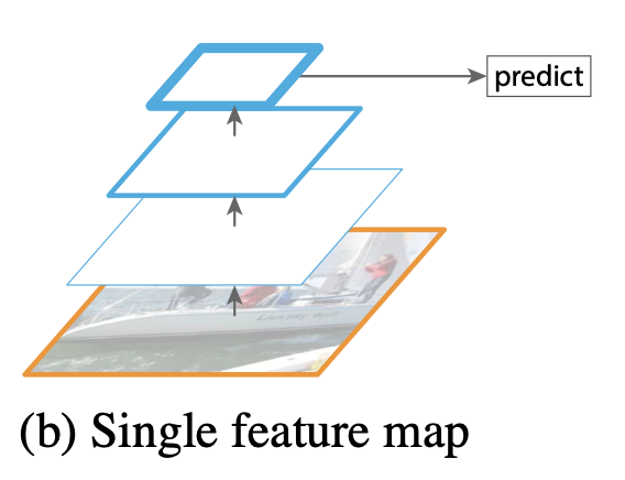 다른 방법으로는 단일 이미지에서 convolution 연산을 통해 resolution이 낮은 feature를 추출하고, 이를 이용해 prediction을 수행하는 것이 있다. 이는 연산량 측면에서는 유리하지만 결과적으로 single scale 이미지에서 추출된 feature이기 때문에 scale robustness가 부족하다.