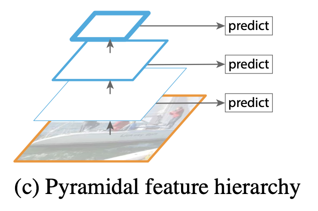 또 다른 방법으로는 resolution을 줄여가면서 feature를 추출할 때 줄여나가는 과정에서 나왔던 다양한 scale의 feature를 모두 사용해서 prediction을 수행할 수도 있다. 이러한 방식의 문제는 이전에 추출된 high resolution의 feature는 나중에 추출된 low resolution의 feature에 영향을 줄 수 없다는 것이다. (large segmantic gaps caused by different depth) 따라서 이러한 문제를 해결하기 위해 Feature Pyramid Network (FPN)이 등장했다.