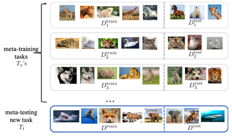 Few-show learning을 평가하는 방식은 주로 Meta-Learning을 사용한다. 아래 그림과 같다.