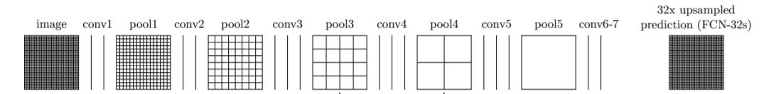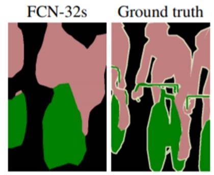 아래와 같이 conv7을 거치면 출력 이미지가 작아 32배의 upsampling을 수행하여 출력물이 동일한 크기의 입력 이미지를 갖도록 한다. 하지만 coarse한 결과를 upsampling하기 때문에 detail이 뭉개진 segmenation 결과를 얻을 수 밖에 없다.