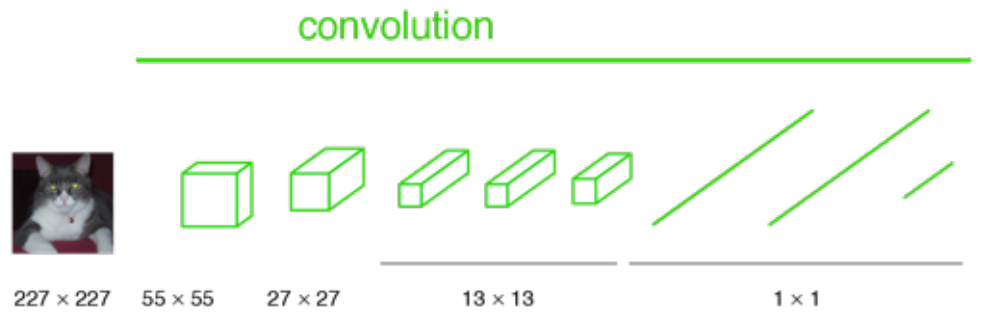 All layers are convolutional layers 그리고 만약 이미지가 축소되지 않는다면, 출력은 단일 라벨이 되지 않을 것이다. 대신, 출력의 크기가 입력 이미지보다 작다.(max pooling으로 인해)