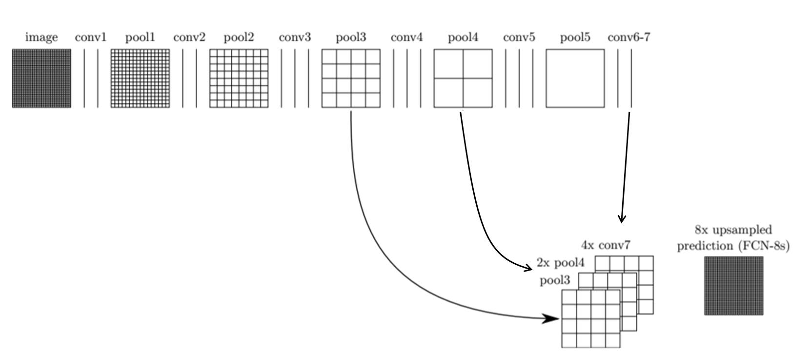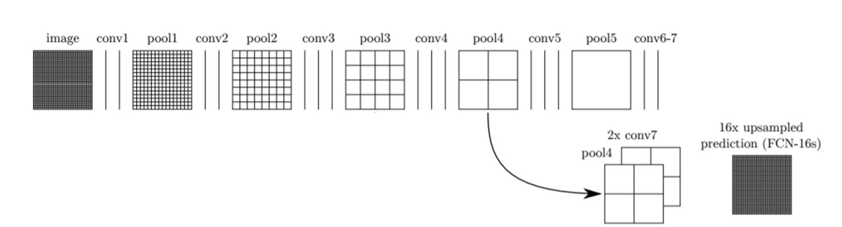 Fully Convolutional Networks with Skip Combining : FCN-16s FCN-32s에서 마지막 conv 7에서 32배 upsampling하여 segmentation 결과를 만들었다. 하지만, FCN-16s에서는 마지막 conv layer 결과를 2배 upsampling 하고 pool 4 layer의 결과와 합쳐준다. 그리고 난 후, 그 합쳐진 결과를 16배 upsampling 하여 FCN-16s 라는 segmentation 결과 이미지를 만들어 낸다. 참고로 여기서 합친다는 말은 그냥 더해준다는 의미이다. 같은방법으로 FCN-8s의 구조는 아래와 같다.