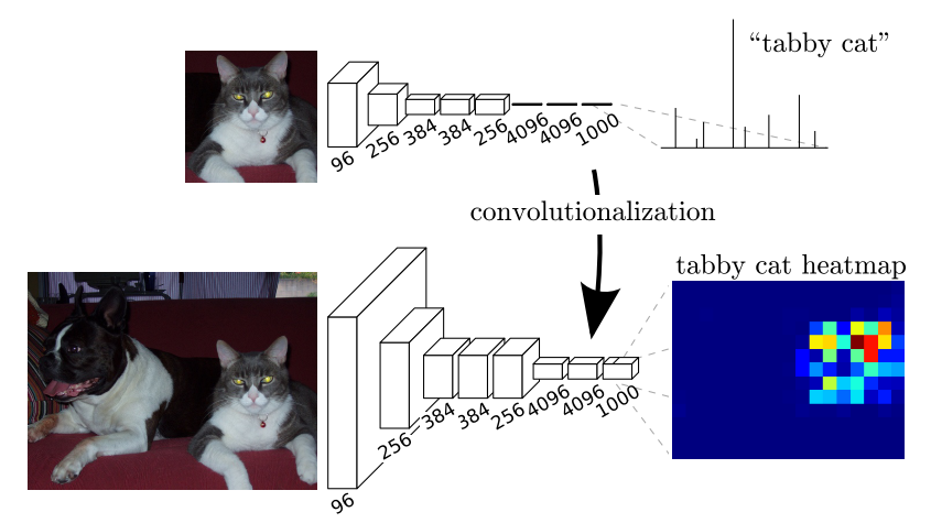 Transforming fully connected layers into convolution layers enables a classification net to output a heatmap 위 그림에서 4096, 4096, 1000이라고 표현된 1x1 conv layer를 확인할 수 있다. (여기서는 1000개의 클래스에 대해 표현했지만 실제로는 21개의 클래스에 대해 실험한다. 즉 1000->21) 마지막 1x1 conv layer에서 depth channel은 각 class를 의미하므로 1000개의 class 중에서 tabby cat에 대한 feature map을 확인해보면 위와 같이 tabby cat에 대한 heatmap을 구할 수 있다.