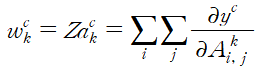 y는 네트워크의 출력 노드이며 A는 feature map이다. 즉 feature map에 대한 출력 노드의 gradient의 GAP가 CAM을 구하기 위한 새로운 weight가 된다.