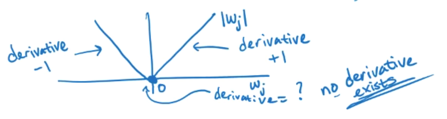 문제는 원점에서의 도함수가 존재하지 않다는 것이다. 따라서 lasso regression의 closed-form solution은 존재하지 않는다.