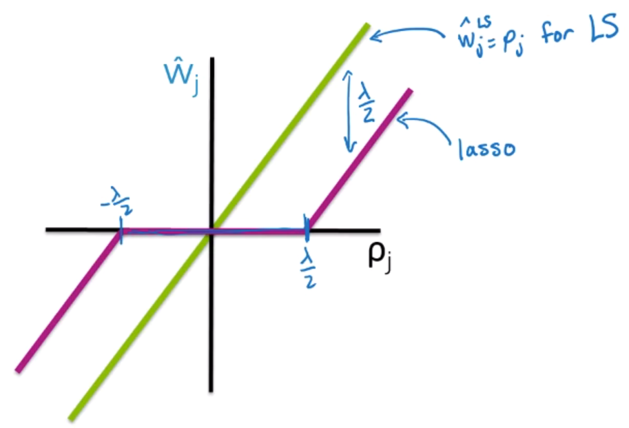 lasso의 경우 feature와 모델의 상관관계가 특정 이하면 weight가 완전히 0이 된다. 이것은 왜 lasso가 feature selection을 수행하는지에 대한 이유이다.