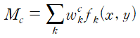 먼저 각각의 feature map 중 (위 그림에서의 BRG색으로 표현된 3개 층) k번째 feature map을 f_k, 각 feature map에서 (x, y)에 위치한 값을 f_k(x, y)라고 하자. 이제 GAP 과정을 거치면 등장하는 값(위 그림에서 BRG의 큰 노드)을 F_k라 하면 다음과 같은 수식이 성립한다.