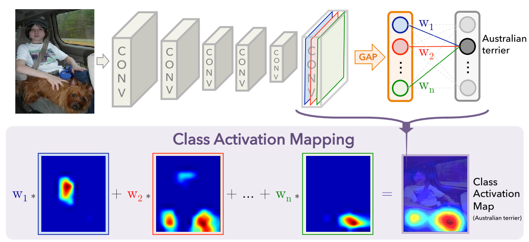 라고 하면 M_c가 바로 class c의 class activation map(CAM)이 되고 이는 (x, y)에 위치한 값이 c라는 class로 분류되는데 미치는 중요도를 나타내게 되는 것이다. 이를 그림으로 표현한 것이 위의 그림이다.