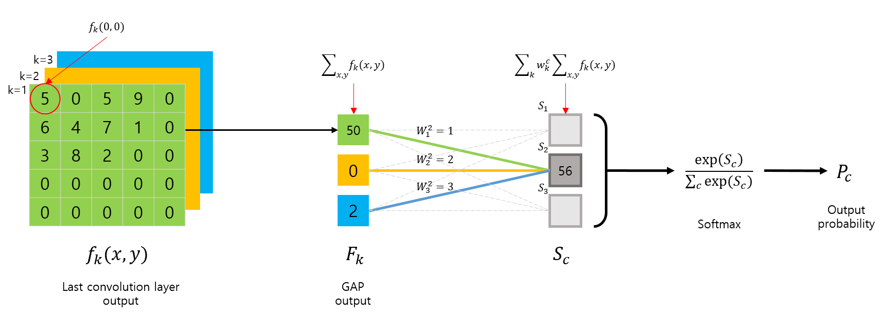 먼저 각각의 feature map 중 (위 그림에서의 BRG색으로 표현된 3개 층) k번째 feature map을 f_k, 각 feature map에서 (x, y)에 위치한 값을 f_k(x, y)라고 하자. 이제 GAP 과정을 거치면 등장하는 값(위 그림에서 BRG의 큰 노드)을 F_k라 하면 다음과 같은 수식이 성립한다.