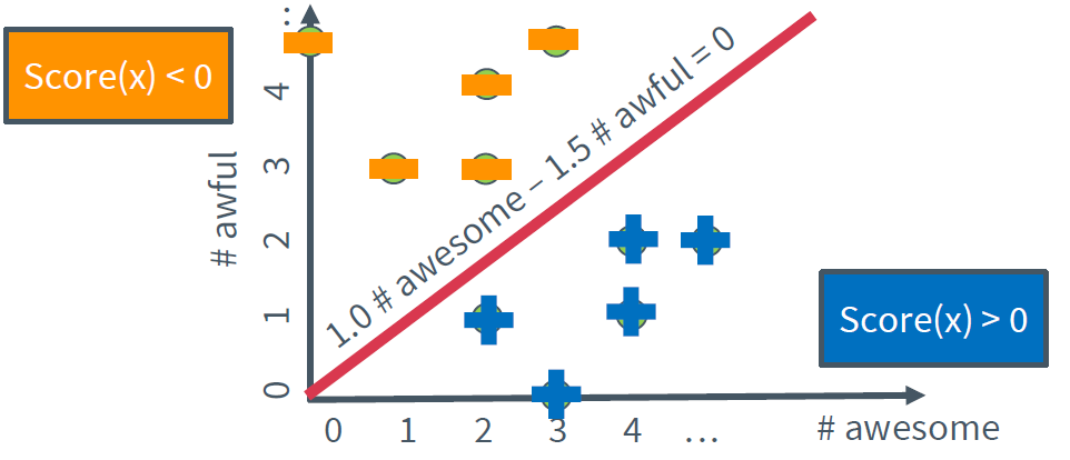 여러 리뷰글을 글에 포함된 awesome과 awful의 단어수에 따라 좌표평면 위에 표현한 것이다. 이제 각 글의 점수를 구하기 위해 아래와 같은 선형식을 이용하자.