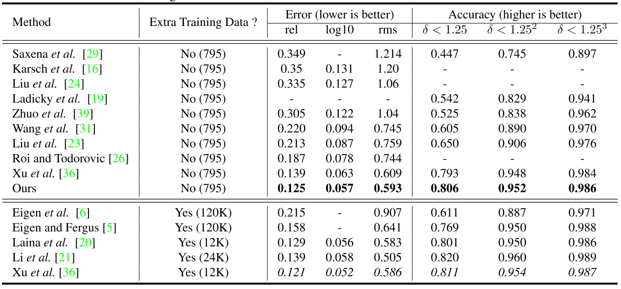 NYU Depth V2와 KITTI 데이터셋에서 SOTA를 달성한다.
