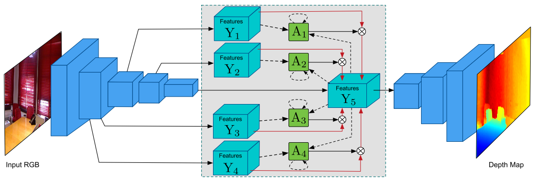 Conditional Random Field (CRF)을 모델에 적용한다. 또한 multi-scale feature들을 학습하기 위해 attention mechanism을 사용한다. 데이터셋은 NYU Depth V2와 KITTI 데이터셋에서 평가된다.
