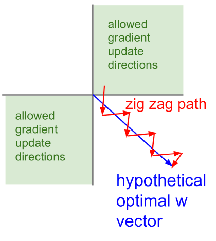 가 모두 같은 부호를 가진다. 따라서 weight가 모두 양수, 또는 모두 음수인 방향으로만 업데이트된다. 이를 그래프로 나타내면 아래와 같이 지그재그 모양으로 보인다.