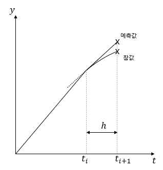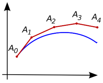 위와 같은 방법으로 $t_i$에서의 함수 값을 알면 위 과정을 반복하여 그래프를 근사하는 것이 가능하다. (이 전 그래프의 $A_0$, $A_1$, $A_2$, $A_3$, $A_4$와 유사하며, 단점은 오일러 방법은 뒤로 갈수록 오차가 누적된다는 점이다.) 오일러 방법을 반복해서 그래프를 근사하는 자세한 방법은 아래 글을 참고하면 된다.