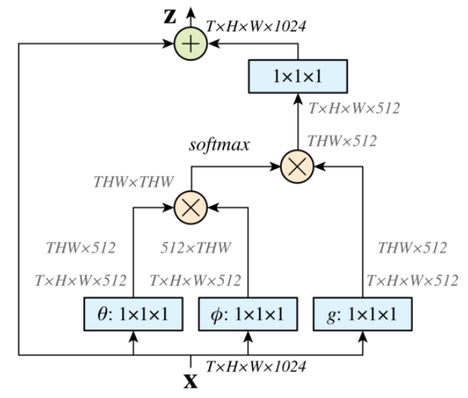 $f\left(x_i,y_i\right)$ 부분이 바로 두 위치의 관계를 계산하는 부분인데, 여기선 두 위치의 관계를 각 위치의 채널 축 값 간의 dot product로 정의하였다. 전체 과정을 그림으로 표현하면 다음과 같다.